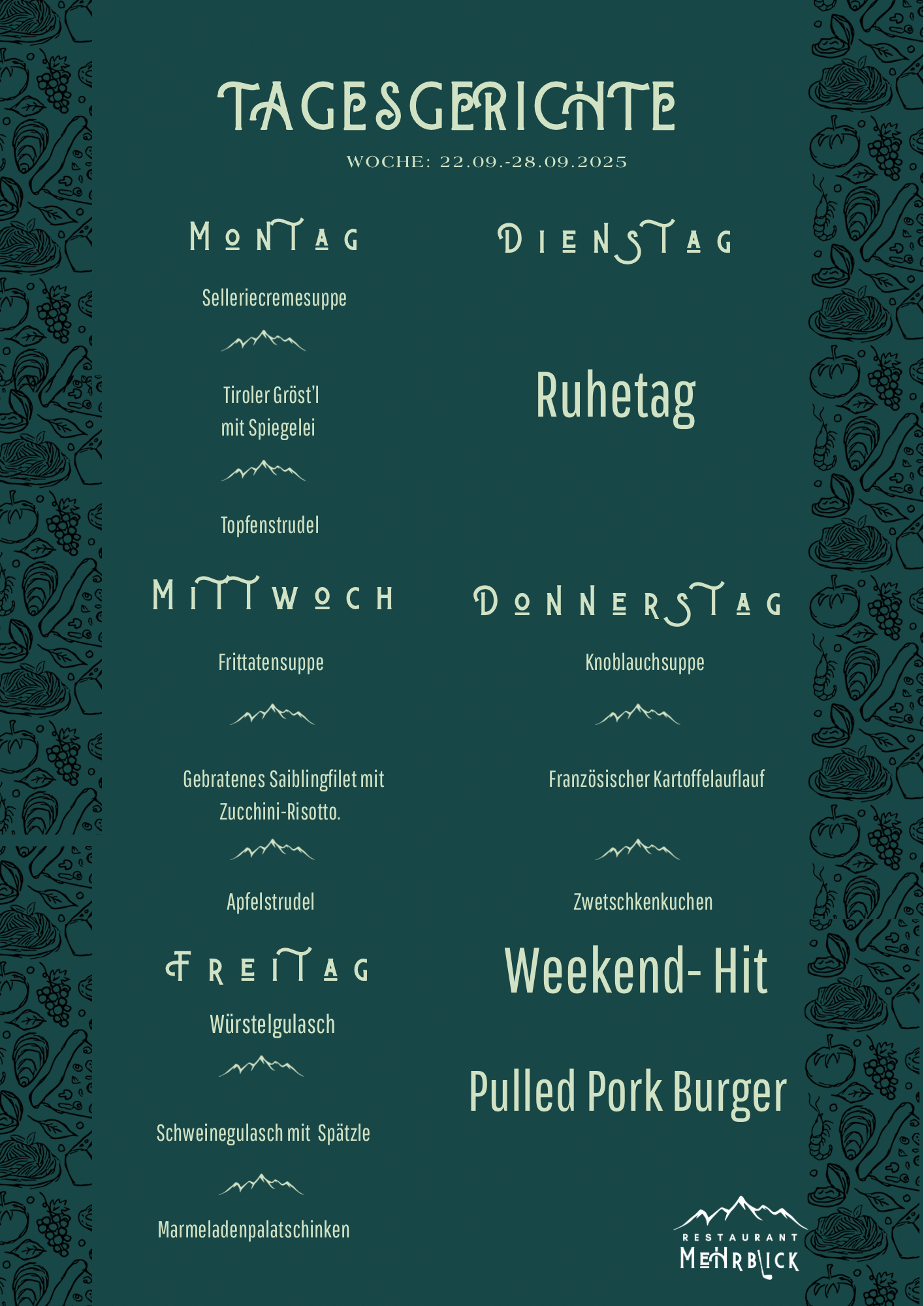 CALL +4366493067566Genieße den atemberaubenden Ausblick und die Gastfreundschaft des Restaurant Mehrblick am Golfplatz Urslautal. Ein herzliches Willkommen! Wir können es kaum erwarten, euch an eurem neuen Lieblingsplatz begrüßen zu dürfen. Es erwartet euch ein herrliches Angebot an Österreichischen Weinen, Sprudel, verschieden Spritzer oder unsere hausgemachte Limonaden. Unser freundliches Mehrblick Team serviert Ihnen hier regionale und saisonale Gerichte. Egal ob was zu Snacken, Gaumenschmaus oder ein Doppel Boogey(Tagesgericht) alles wird mit viel Liebe, Leidenschaft und Passion von unserem Küchen- Team zubereitet.